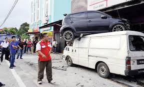 Orang ramai melihat kereta Myvi yang terbabas ke atas sebuah Van di Jalan Long Yunus, Kota Bharu.